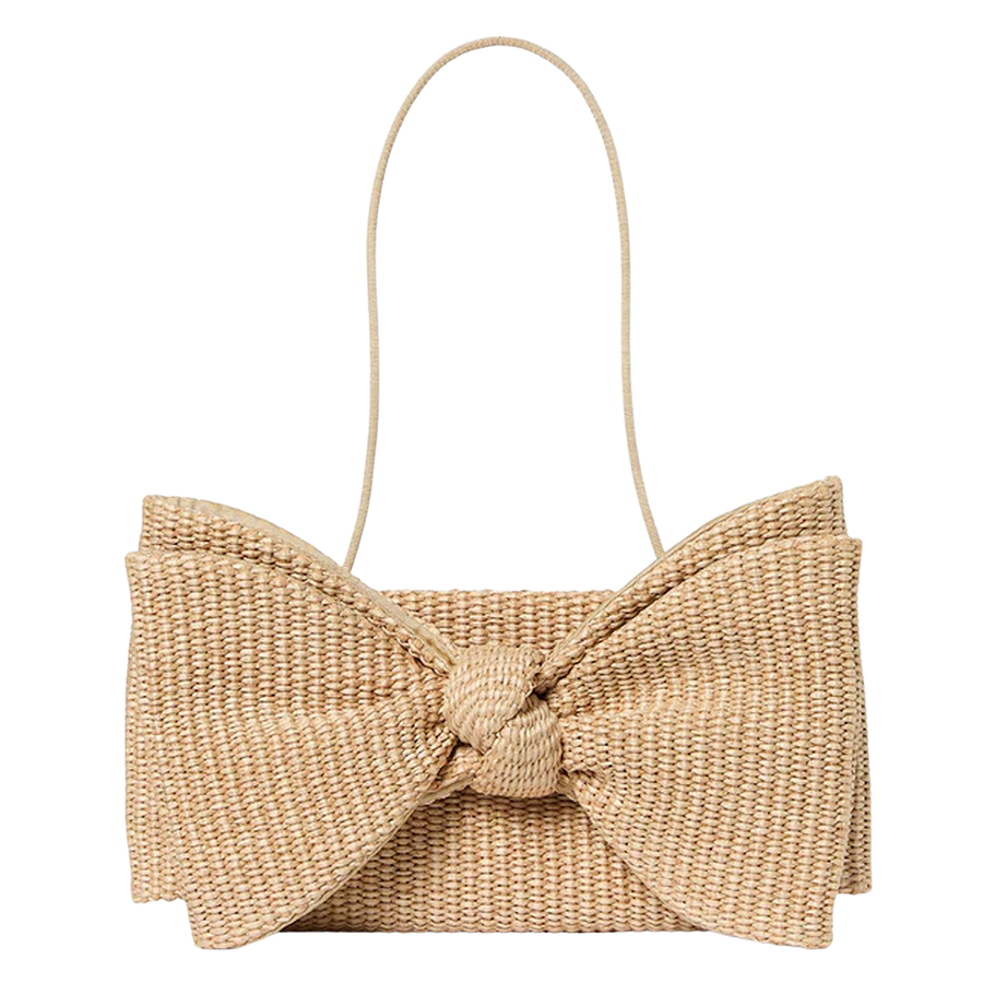 Loeffler RandallWe are loving this clutch in natural woven fabric! The statement bow is everything. Features a removable shoulder strap, full lining and magnetic closure.
