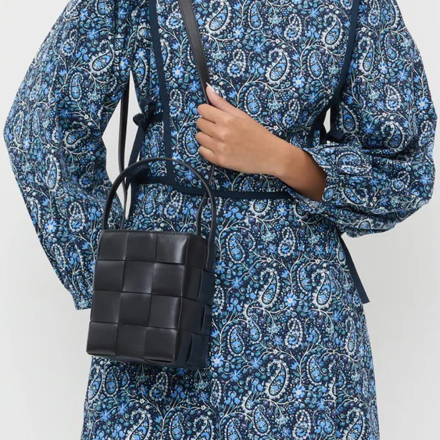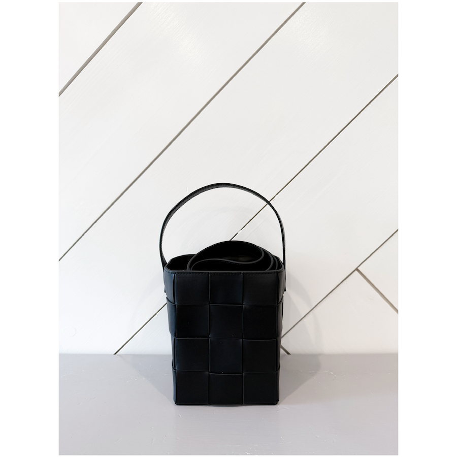 Such a chic & cool bag to carry by hand or over the shoulder with the strap! Small bucket bag in black wide woven vachetta leather. Features a vachetta leather strap, drawstring closure, and full lining.